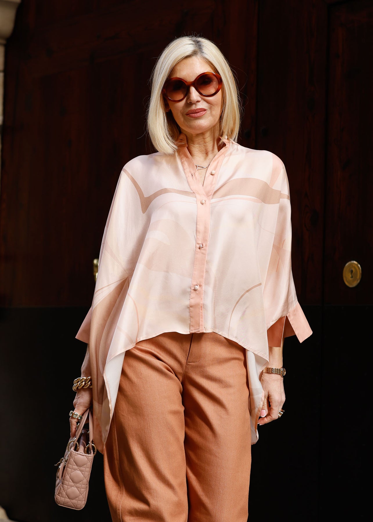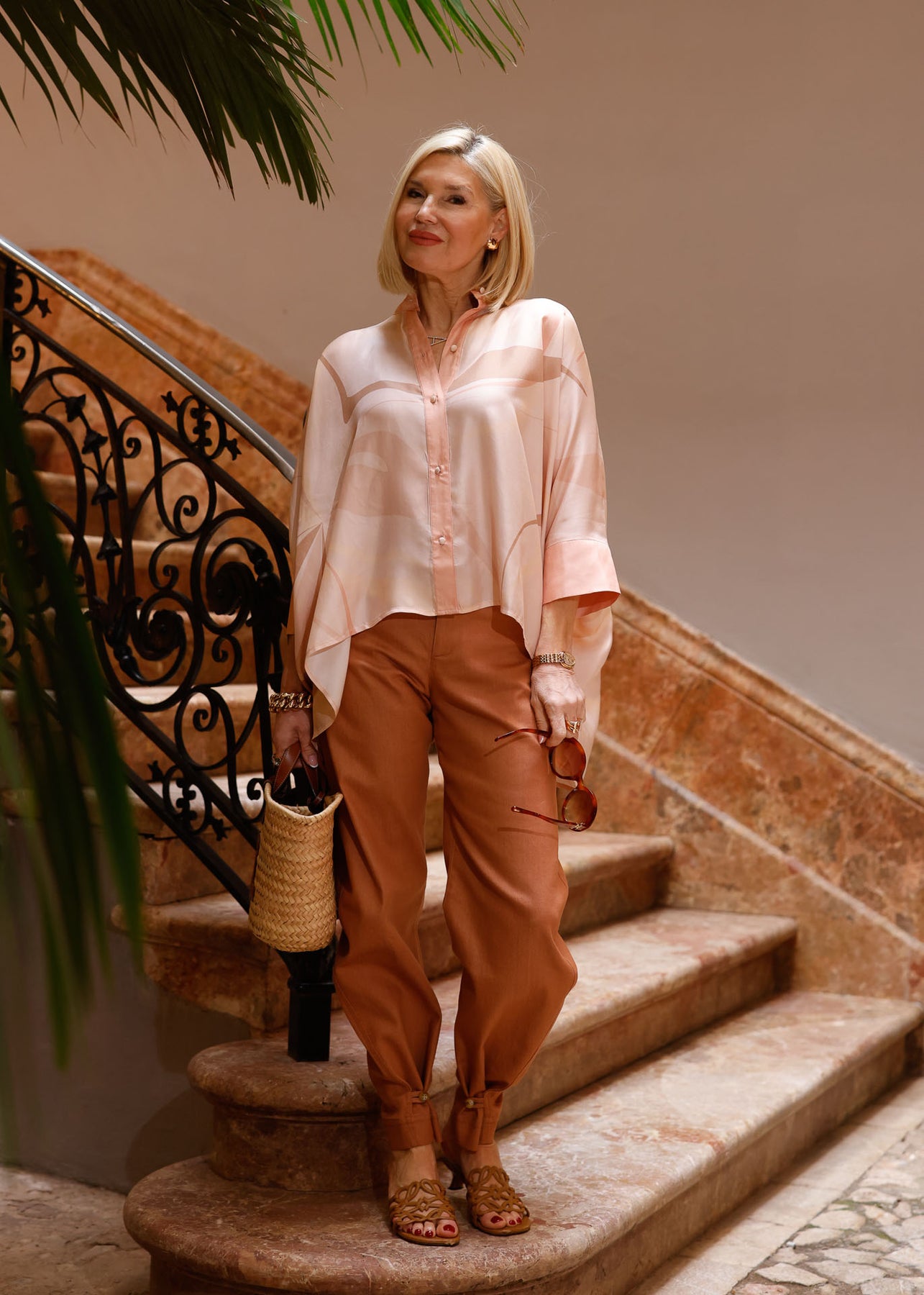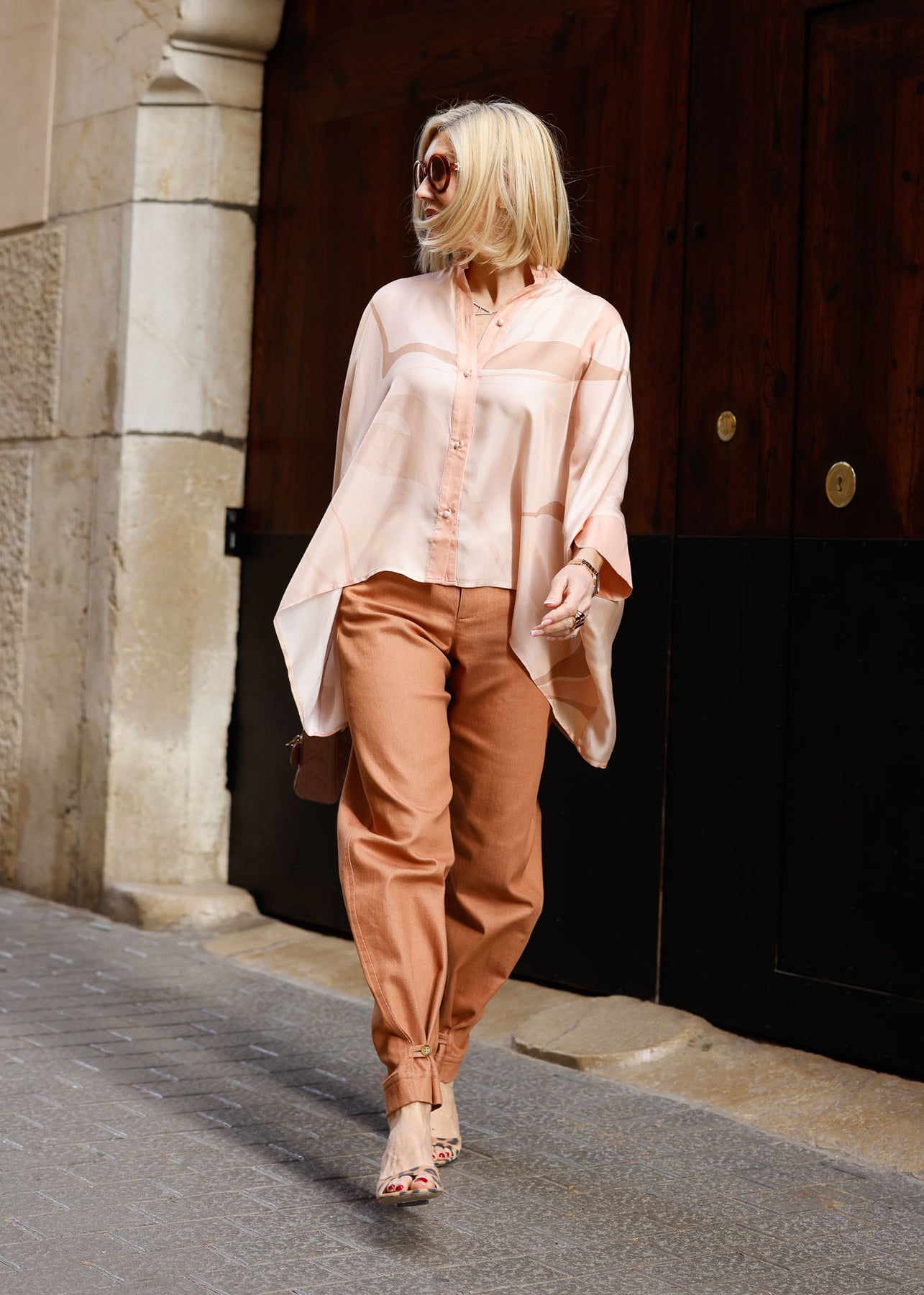 Diese Seidenbluse mit zarten rosa- und sandfarbenen Ornamenten vereint mühelos Leichtigkeit und feminine Eleganz – das perfekte Must-have für einen stilvollen Look. Der fließende Stoff schmiegt sich sanft an die Haut, während die elegante Schnittführung die Figur schmeichelhaft umspielt.