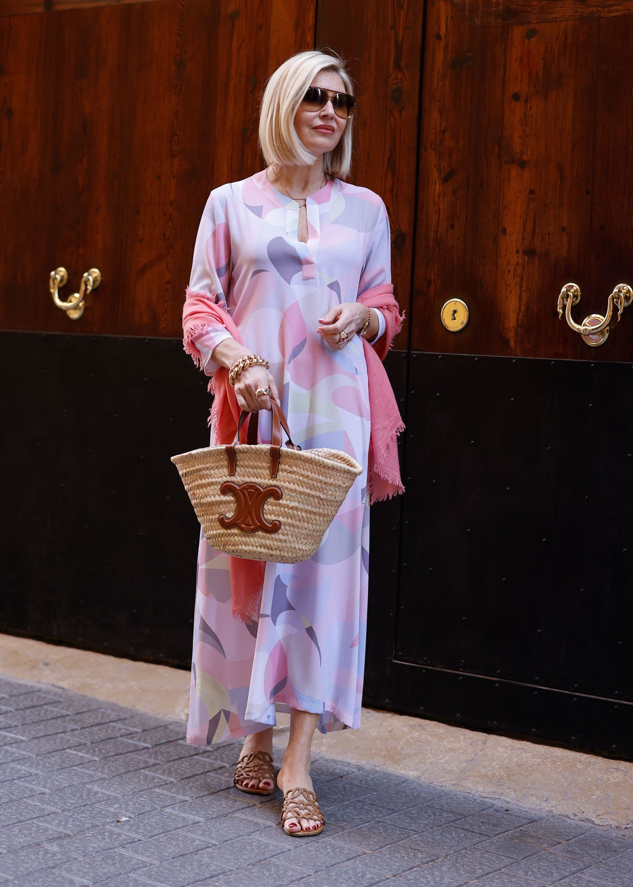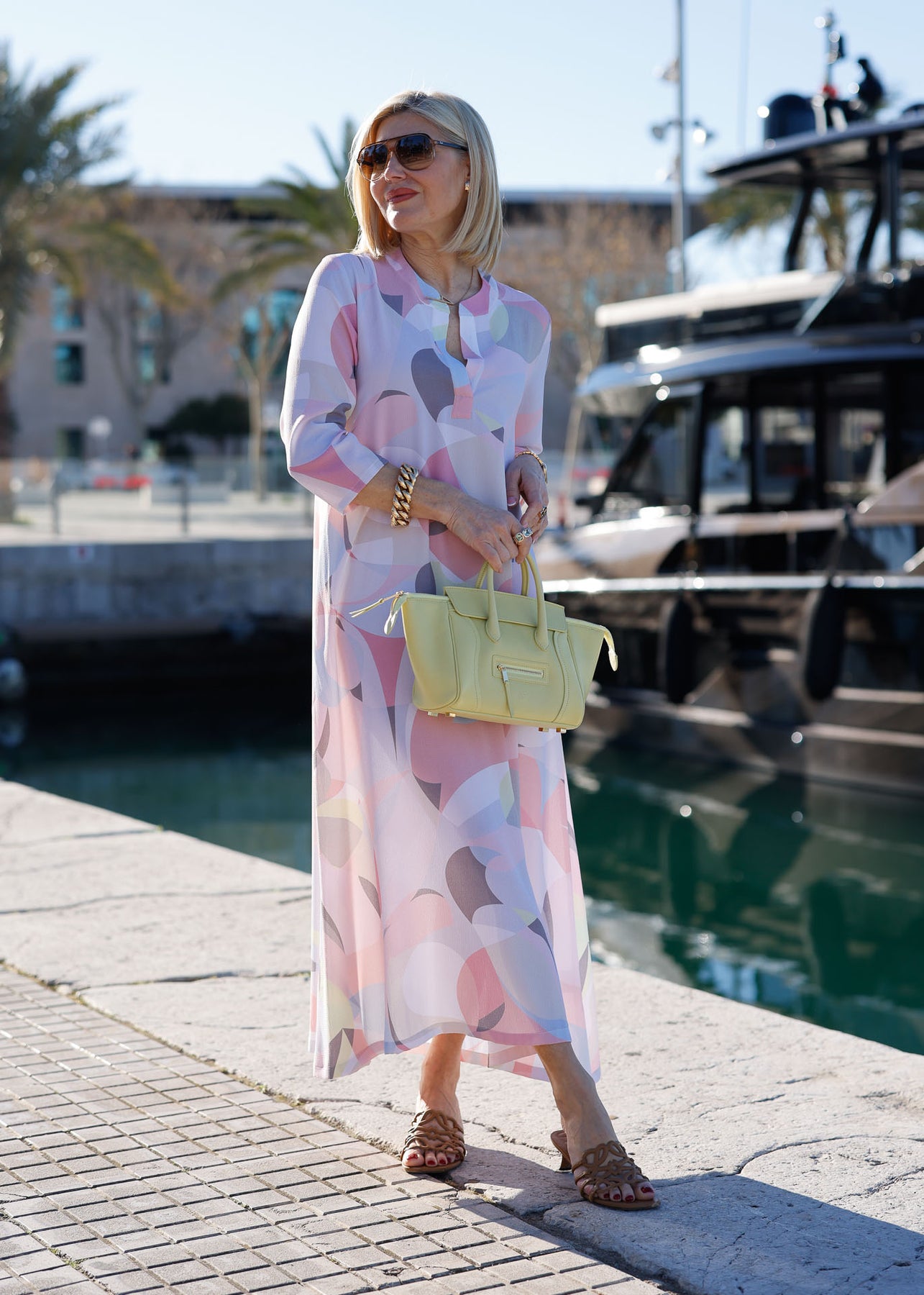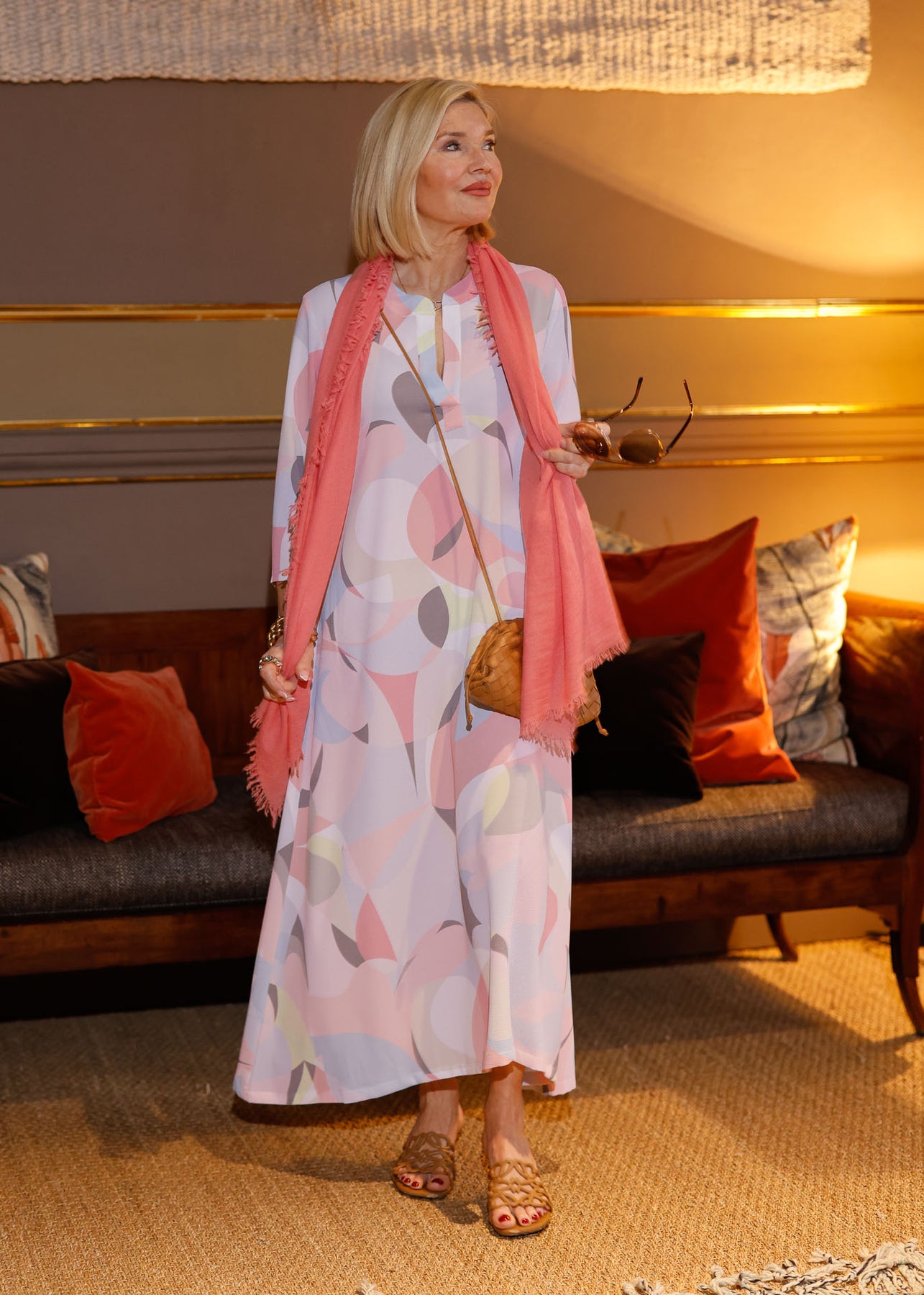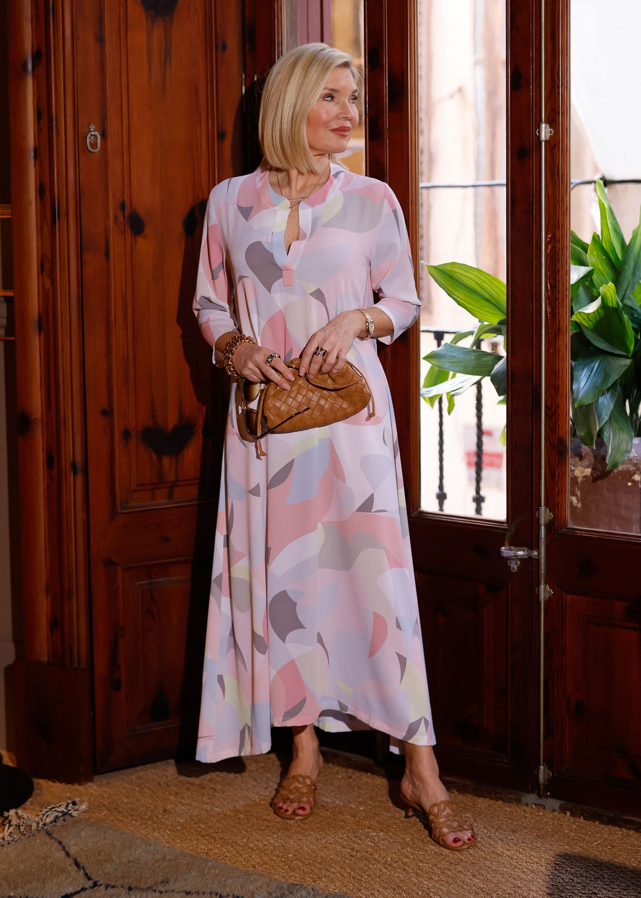 Das elegante Sommerkleid besticht durch sein auffälliges, harmonisches Muster in Pastelltönen. Dieses Kleid ist der perfekte Begleiter für den gesamten Tag – es verleiht Ihnen sowohl tagsüber einen lässig-eleganten Look als auch abends eine stilvolle Ausstrahlung. Der fließende Stoff und der schmeichelhafte Schnitt sorgen für hohen Tragekomfort und eine mühelose Eleganz.