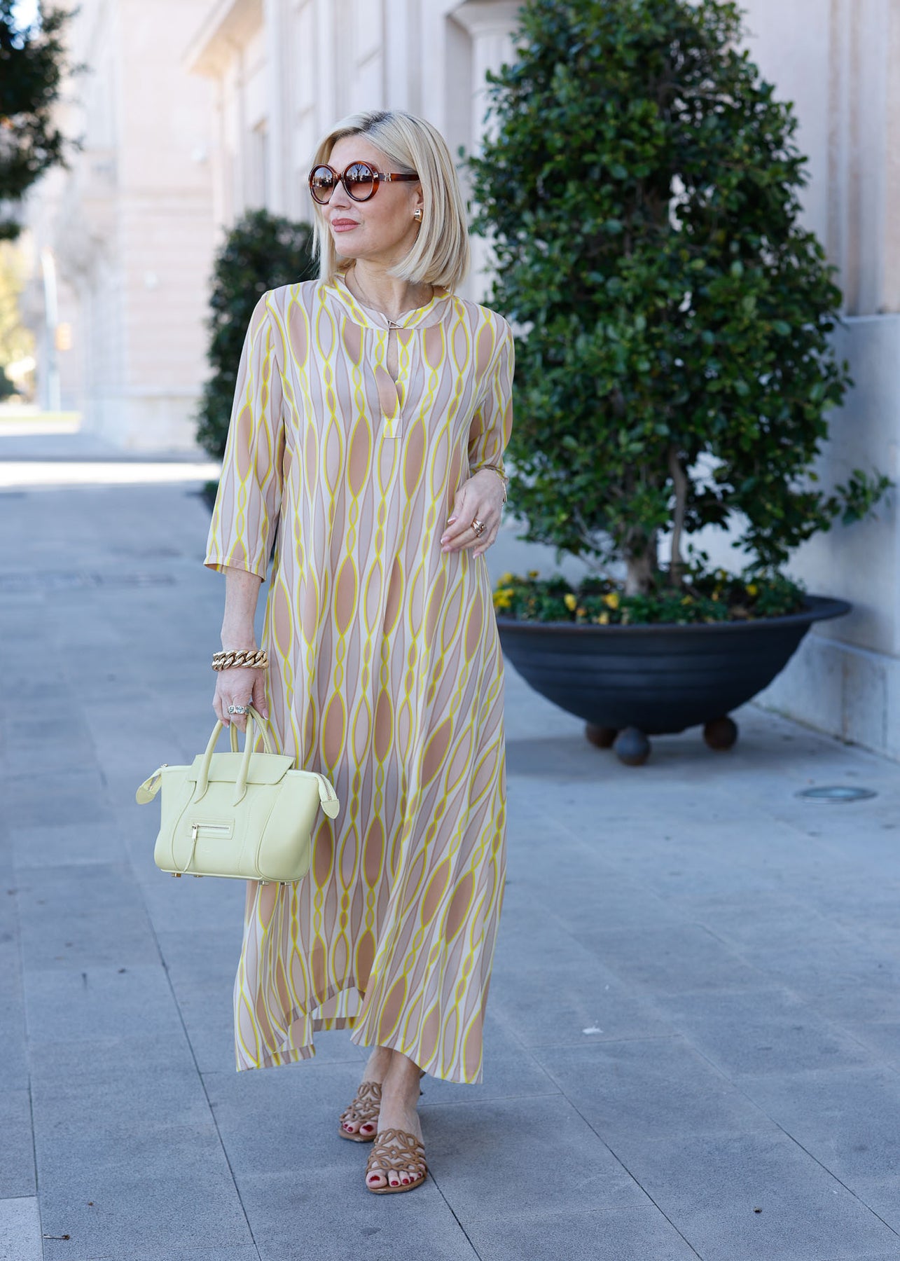 Das elegante Sommerkleid besticht durch sein auffälliges, harmonisches Muster mit ovalen Formen in Gelb- und Beigetönen. Dieses Kleid ist der perfekte Begleiter für den gesamten Tag – es verleiht Ihnen sowohl tagsüber einen lässig-eleganten Look als auch abends eine stilvolle Ausstrahlung. Der fließende Stoff und der schmeichelhafte Schnitt sorgen für hohen Tragekomfort und eine mühelose Eleganz.