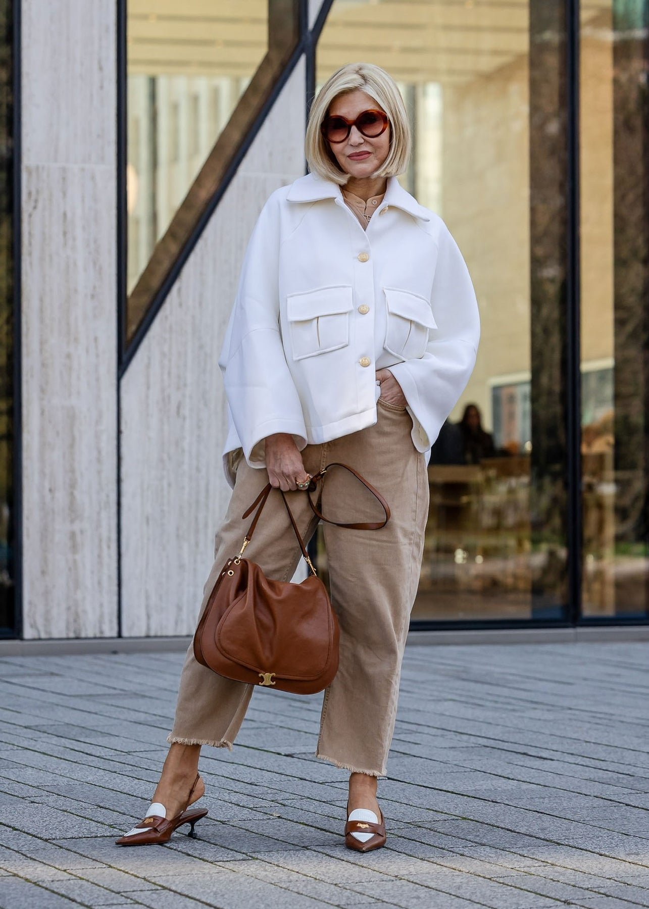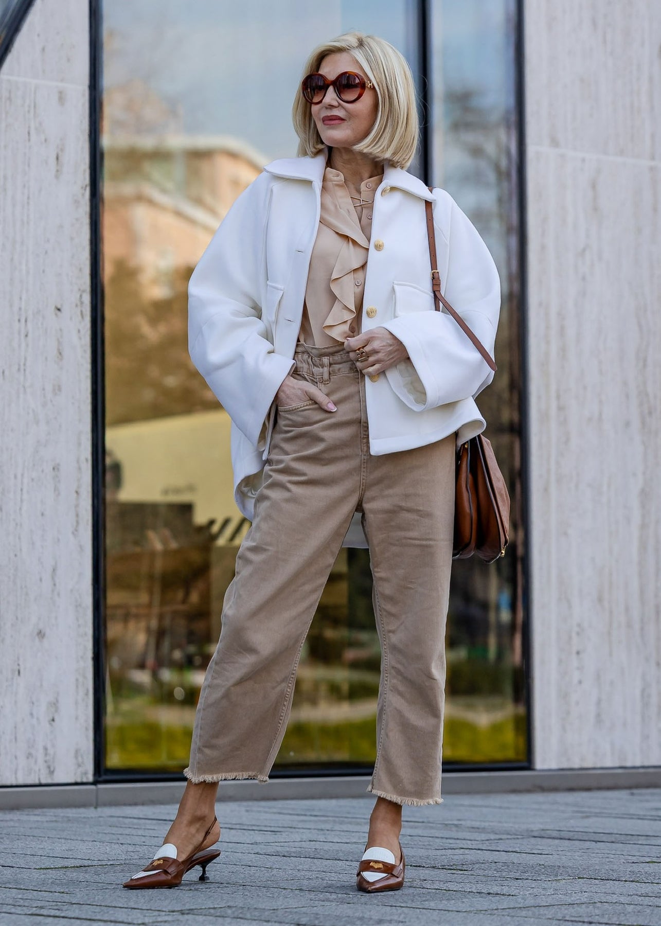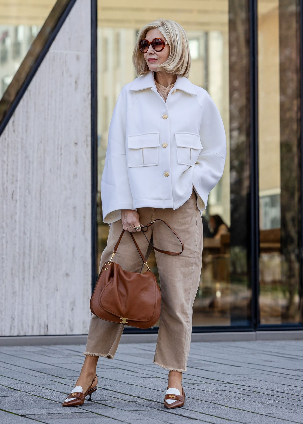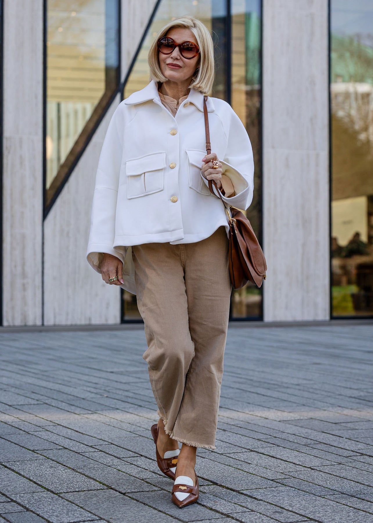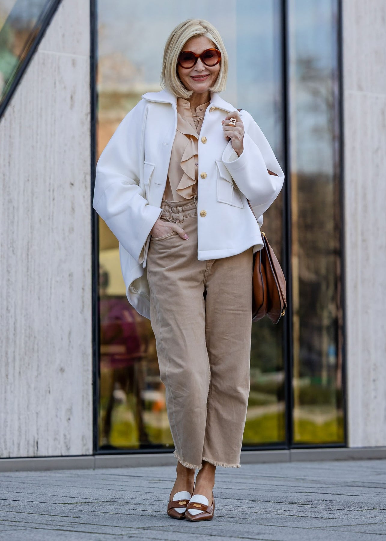 Die elegante oversized Jacke in klassischem Off-White vereint modernen Chic mit zeitloser Eleganz. Ihr eleganter Oversize-Schnitt wird durch den ausgestellten Kragen und die weit ausgestellten Ärmel perfekt ergänzt. Die Knopfleiste, verziert mit goldenen Knöpfen, setzt einen stilvollen Akzent und rundet das edle Design ab. Ideal für einen glamourösen und zugleich lässigen Auftritt.