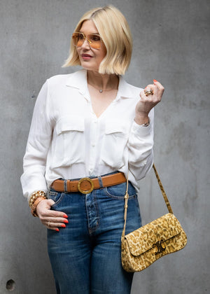 - 1/2-Arm Shirtbluse mit gekräuseltem Stehkragen & gekräuseltem Ärmelsaum - Premium Seiden Qualität in sand washed Finishing - 100% Seide - Petra is 1.65 m tall and wears a size 36