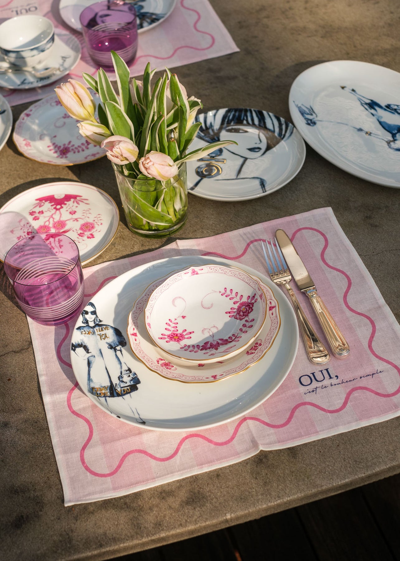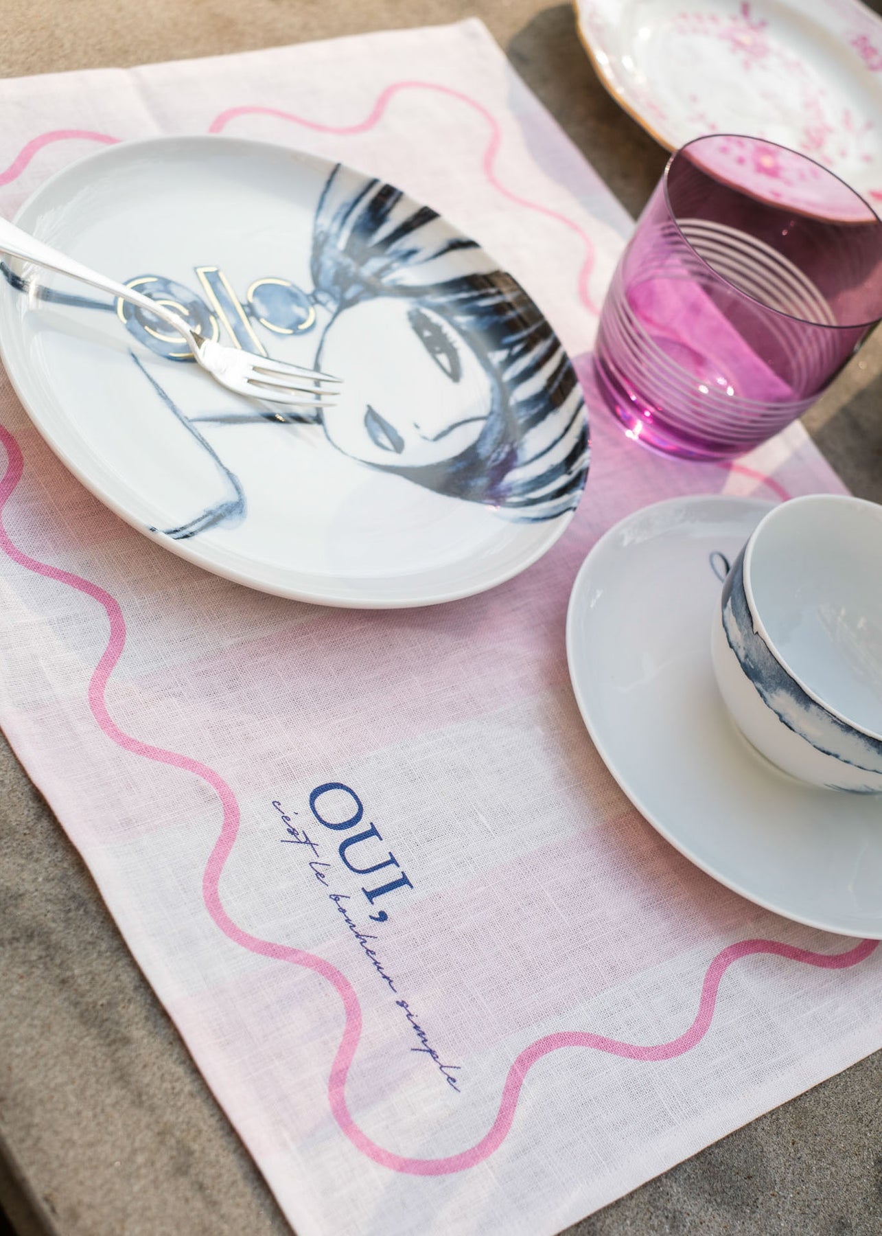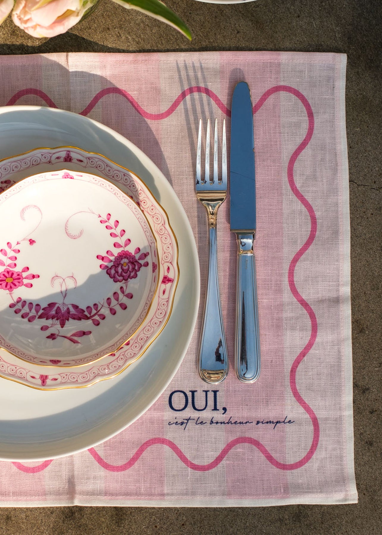 Gefertigt aus hochwertigem Premium-Leinen, kombiniert es die Leichtigkeit des Sommers mit einem modernen Design. Der sinnliche, französische Schriftzug „Oui, c’est le bonheur, simple.“ (Ja, Glück steckt in den kleinen Dingen“) macht dieses Tischset zu einem stilvollen Highlight für jede Tafel.