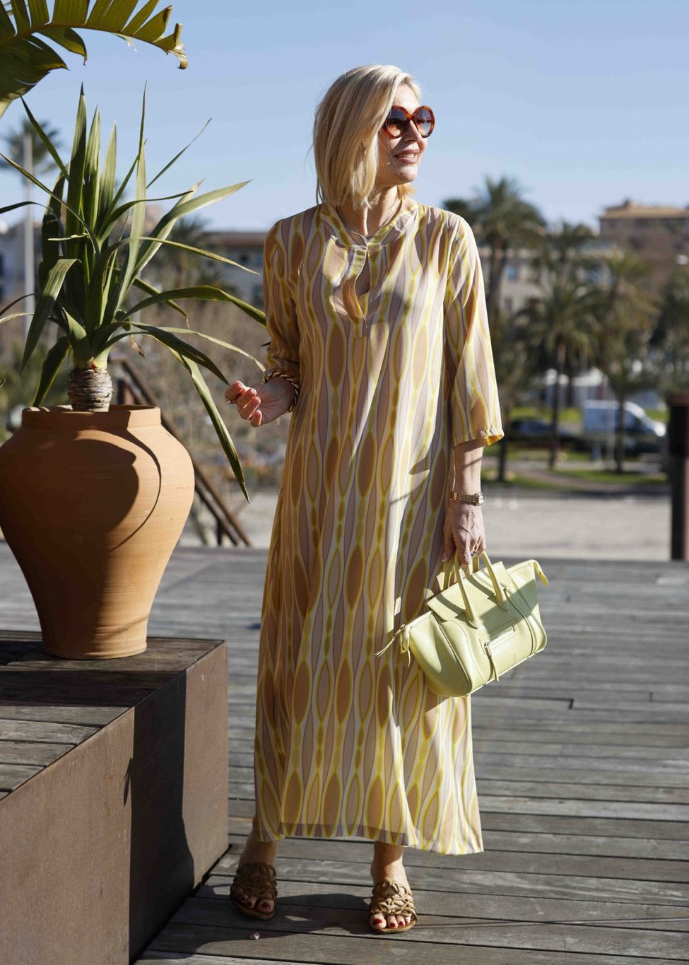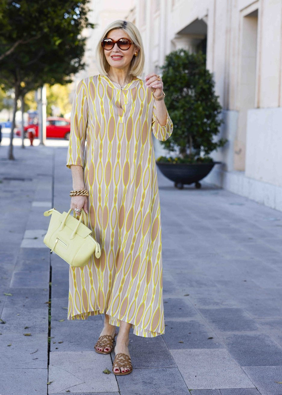Das elegante Sommerkleid besticht durch sein auffälliges, harmonisches Muster mit ovalen Formen in Gelb- und Beigetönen. Dieses Kleid ist der perfekte Begleiter für den gesamten Tag – es verleiht Ihnen sowohl tagsüber einen lässig-eleganten Look als auch abends eine stilvolle Ausstrahlung. Der fließende Stoff und der schmeichelhafte Schnitt sorgen für hohen Tragekomfort und eine mühelose Eleganz.